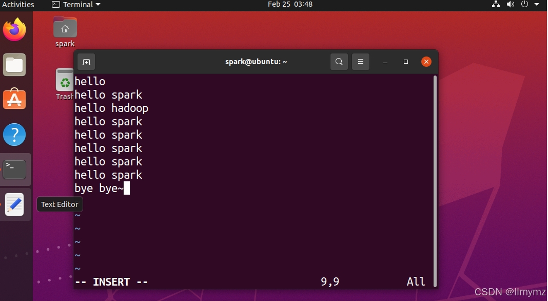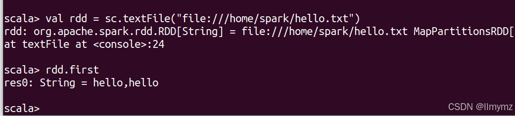 个文件,路径为:/mydata/hello.txt,下面准备测试在 SparkShell 中读取这个文件。请转