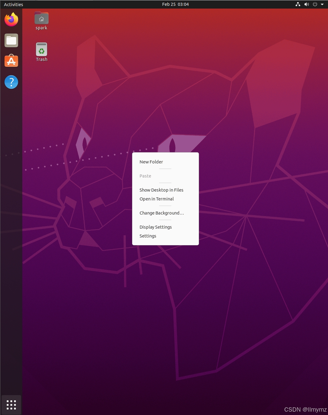 14)鼠标右键点击 Ubuntu20.04 桌面的中间空白位置(注意不是在应用程序图标上),选择弹出菜单中的“Open in Terminal”,启动 Linux 终端控制台窗体。
