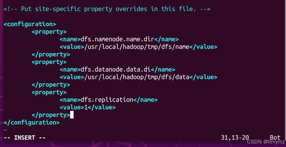 3)修改 HDFS 设置文件 hdfs-site.xml,指定 NameNode 和 DataNode 的数据保存位置。