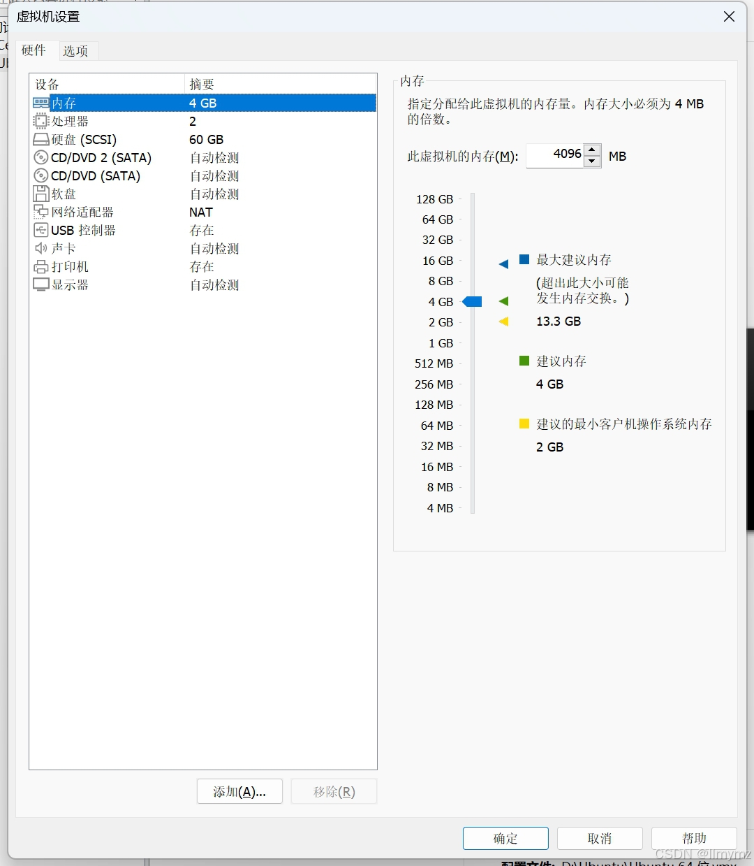 18)在虚拟机设置窗体,调整一下内存和处理器的数量,比如 4GB 内存和 2 个处理器,建议内存至少2GB 以上。