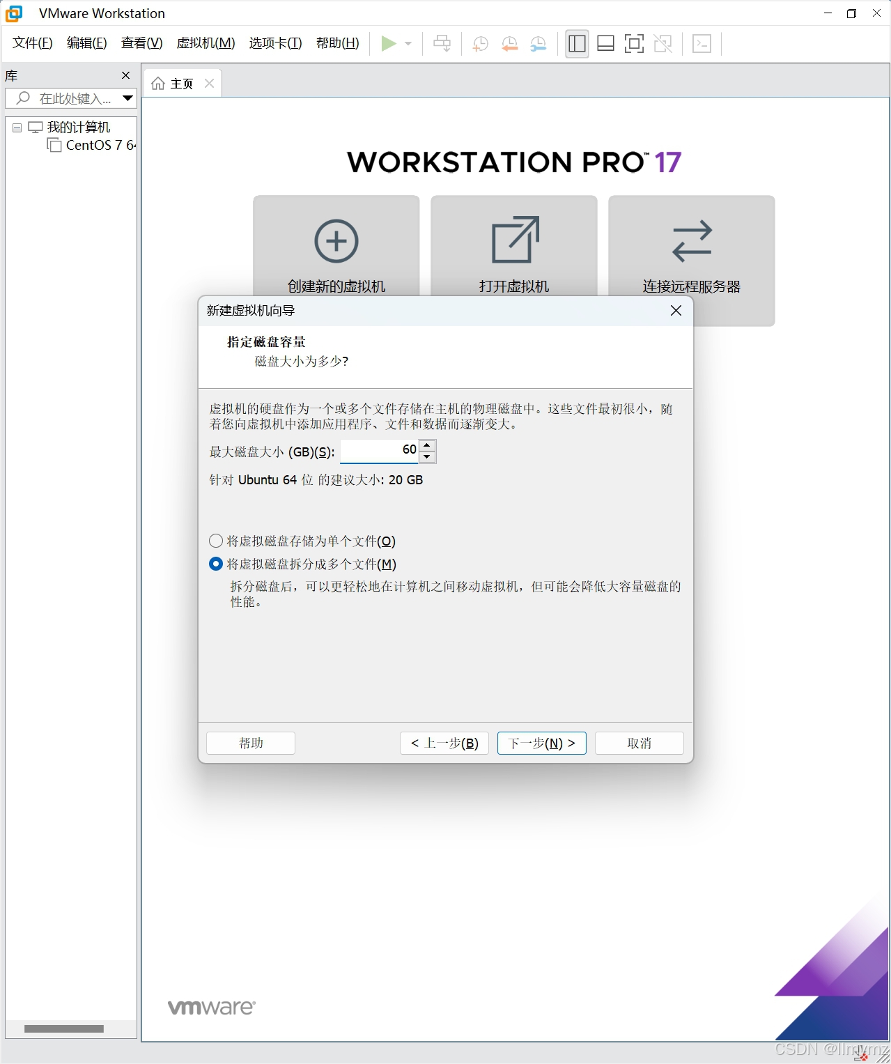 6)在指定磁盘容量窗体中,设定虚拟机使用的最大磁盘大小为 60GB,并选择“将虚拟磁盘存储为单个文件”,然后点击下一步。另外,虚拟机是存储为单个文件还是多个小文件,这个也可以根据自己的喜好选择,没什么实际的影响。