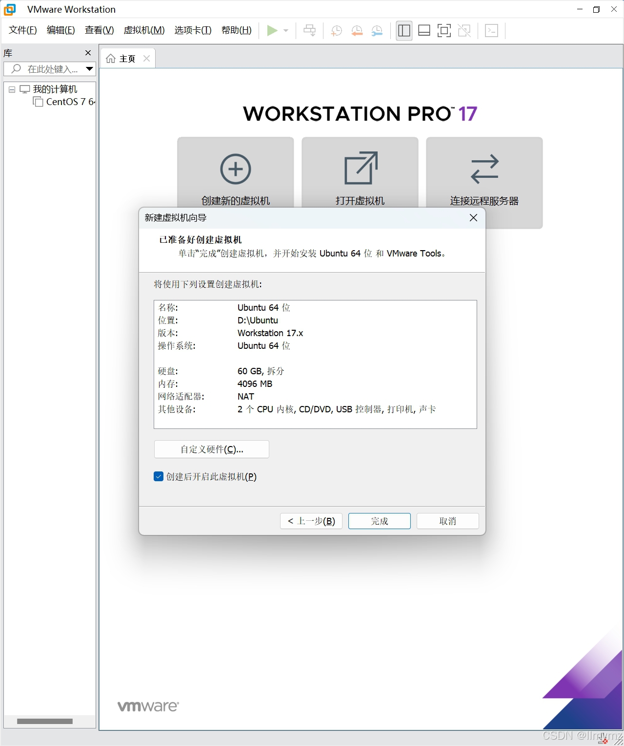 7)最后一步,直接点击结束,完成虚拟机的创建工作,也可以通过“自定义硬件”修改创建虚拟机