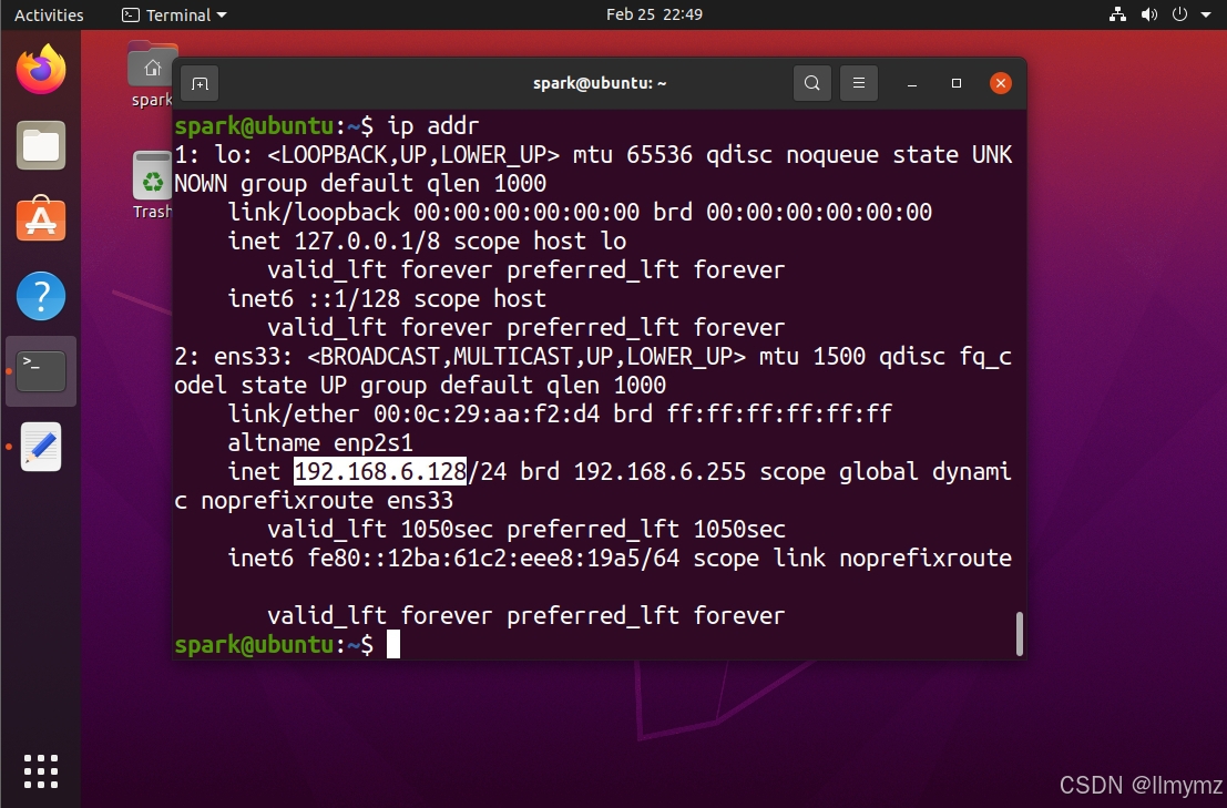 在 Linux 终端窗体中输入下面的命令查看一下当前虚拟机的 IP 地址: