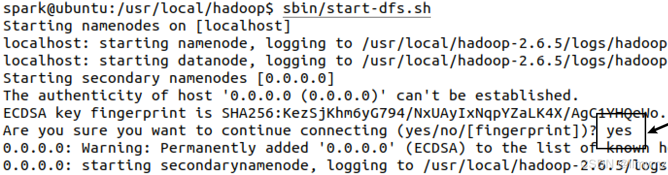 6)接下来启动 HDFS 服务程序,执行过程中会分别运行 NameNode、SecondaryNameNode