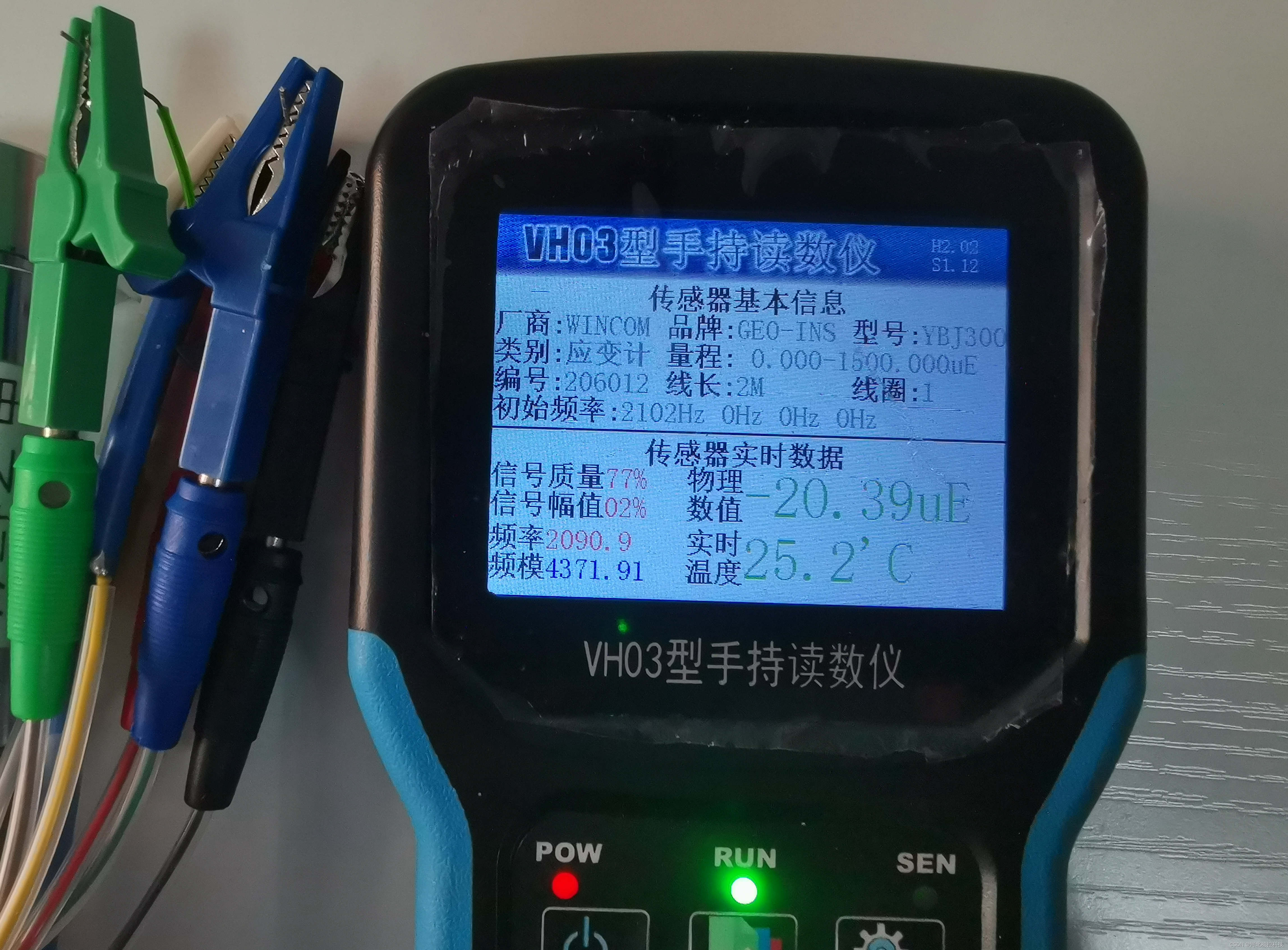 为了更好地使用智能振弦传感器,我们开发了专用的读数仪VH03(手持振弦采集仪),它可以循环检测是否已经连接了电子标签。如果未检测到标签,屏幕显示常规的频率和温度;如果检测到标签,屏幕自动切换为DSensor界面,显示实时频率、温度、传感器类型、物理量、生产厂商等信息。读数仪具有自动检测、自动识别、自动计算功能,可以大大节省测量工程师的数据获取和数据计算时间,避免计算错误的发生。特别是其独特算法,可以解决电子标签远距离通讯难题,使通讯距离达到了惊人的800米,这一距离可满足绝大部分的工程应用。
