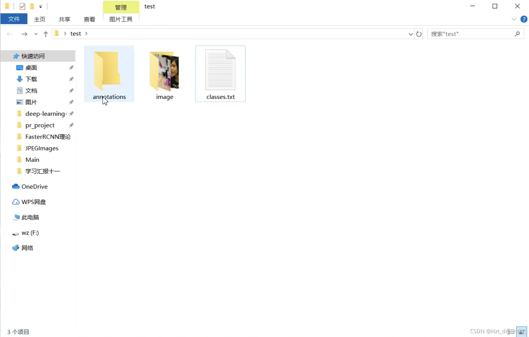 1.数据集中主要有三个文件,一个是标注的图像信息的文件夹,一个是存放图像的文件夹,还有一个记录多少个类的txt文件。