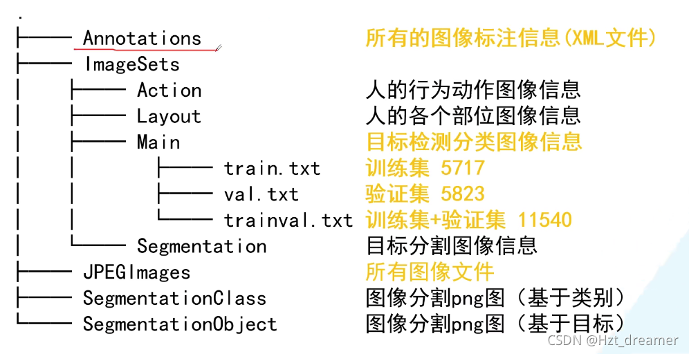 Pascal VOC2012数据集文件结构:1.打开项目文件夹->data->predefined_classes.txt修改标注类别信息2.打开软件(labelImg)3.设置图像文件所在目录,以及标注文件保存目录4.标注图像,并保存5.若要修改源代码在项目的libs->labelFile.py文件中修改1.数据集中主要有三个文件,一个是标注的图像信息的文件夹,一个是存放图像的