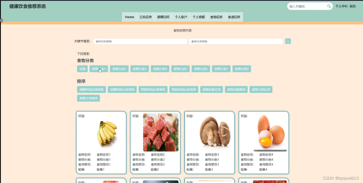 (4)食物信息:在首页导航栏上点击“食物信息”弹跳出的是食物信息列表,可以点击随意一款食物进行了解其具体信息。包括食物名称、食物分类、食用禁忌、能量等;