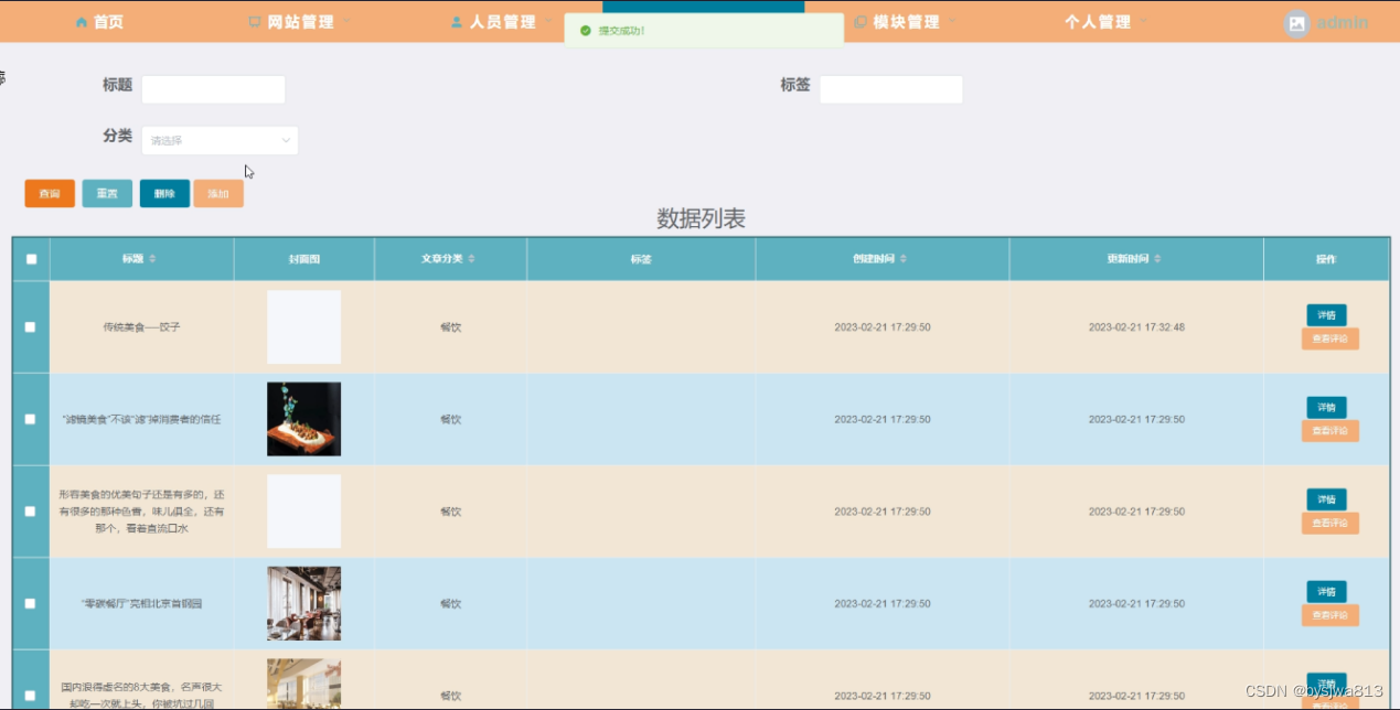 (2)网站管理:当点击“网站管理”这一菜单的时候,会出现公告信息+轮播图这两个个子菜单,可以对这两个模块进行增删改查操作;