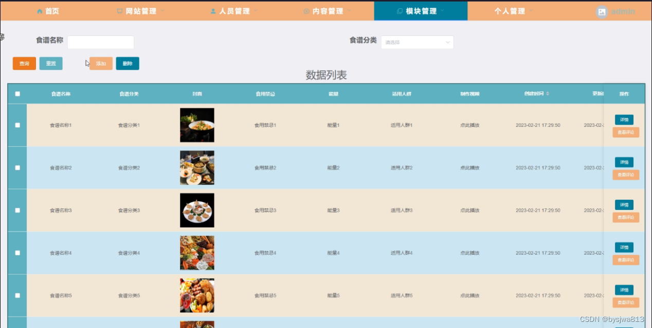(4)模块管理:当点击“模块”这一菜单的时候,会出现食物分类+食物信息+食谱分类+食谱信息这四个子菜单,管理员能够对四个模块进行增删改查操作;