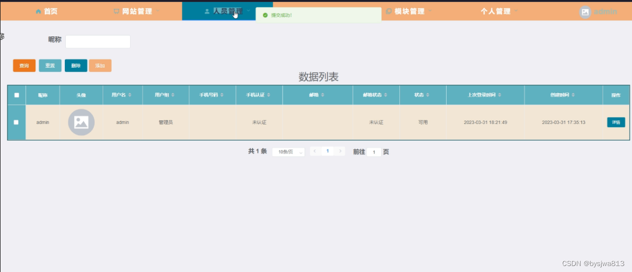 (3)人员管理:当点击“人员管理”这一菜单的时候,会出现管理员+注册用户两个子菜单,可以对这两个模块进行增删改查操作;