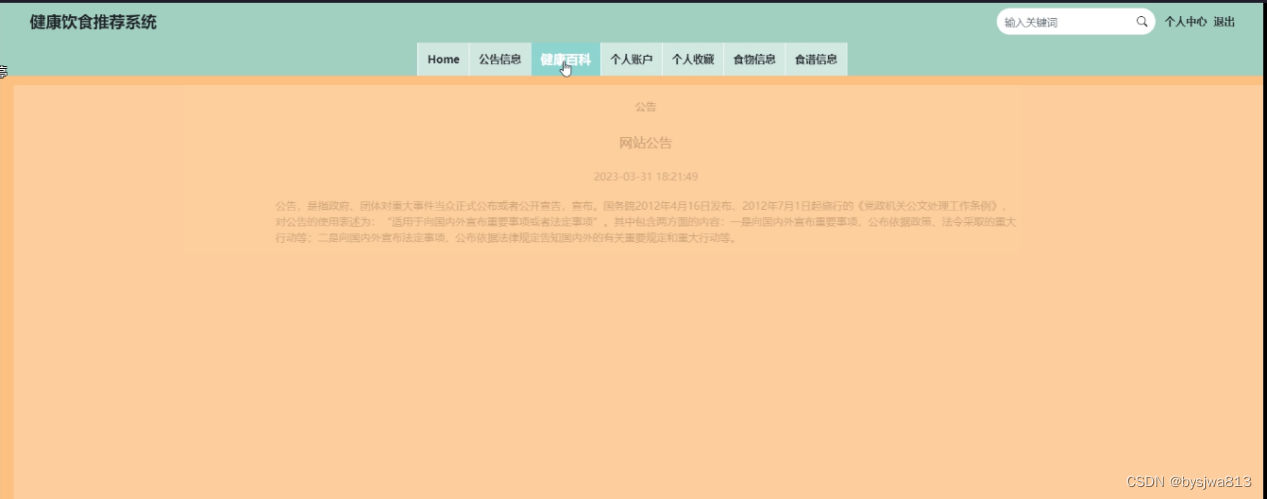 本系统实现功能:首页、网站管理(轮播图、公告信息)人员管理(管理员、注册用户)内容管理(健康百科、分类列表)模块管理(食物分类、食物信息、食谱分类、食谱信息)个人管理(个人信息、密码修改)等功能模块。健康饮食推荐系统使用java语言springboot框架开发,使用 MyEclipse 2017 CI 10 编译器编写,数据方面主要采用的是微软的MySQL关系型数据库来作为数据存储媒介,配合前台H