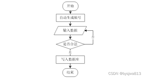 用户成功登入系统后就能够实现增加数据的操作,增加数据的编号是特定的,系统生成,用户不能随意填写,除了编号以外,其他增加信息用户自己填写,填写后的信息经过系统验证,验证合法通过就显示增加数据成功了,相反的话,就没有增加成功,图2-1显示的就是在增加数据时的流程。