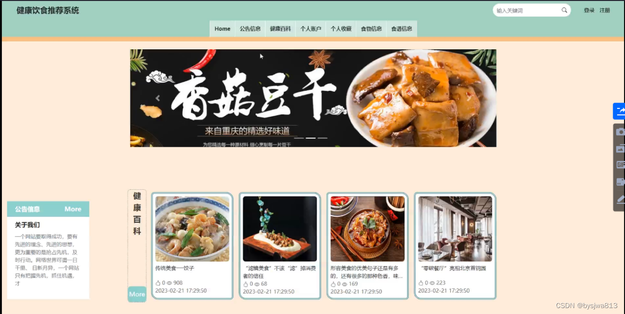 本设计主要实现集人性化、高效率、便捷等优点于一身的健康饮食推荐系统,实现功能:首页、网站管理(轮播图、公告信息)人员管理(管理员、注册用户)内容管理(健康百科、分类列表)模块管理(食物分类、食物信息、食谱分类、食谱信息)个人管理(个人信息、密码修改)等功能模块。系统通过浏览器与服务器进行通信,实现数据的交互与变更。只需通过一台电脑,动动手指就可以操作系统,实现数据通信管理。整个系统的设计过程都充分考虑了数据的安全、稳定及可靠等问题,而且操作过程简单。本系统通过科学的管理方式、便捷的服务提高了工作效率,减少了数据存储上的错误和遗漏。
