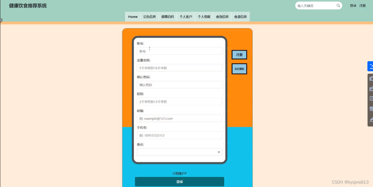 (1)用户注册登录:游客可以随时进入到系统中,对系统中的信息浏览,但是想要实现食物信息以及食谱信息等操作,就必须有这个系统的账号,如果没有账号的话,可以注册以后进行相关的操作,同时用户还可以通过“个人账户”这以按钮对个人信息以及操作的信息进行管控。