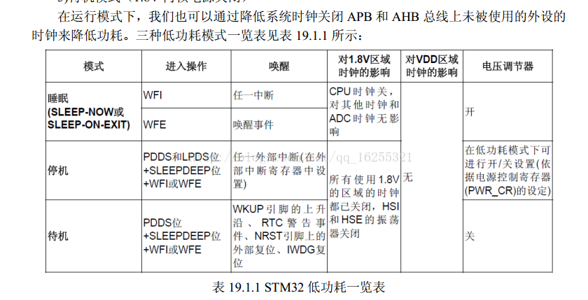 在这三种低功耗模式中,最低功耗的是待机模式,在此模式下,最低只需要 2uA 左右的电流。停机模式是次低功耗的,其典型的电流消耗在 20uA 左右。最后就是睡眠模式了。用户可以根据自己的需求来决定使用哪种低功耗模式。