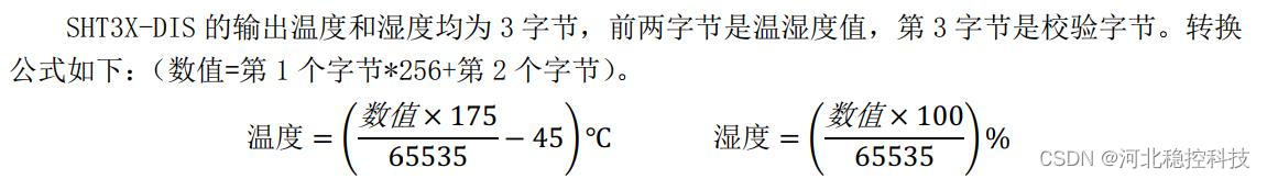 SHT3X-DIS 的输出温度和湿度均为 3 字节,前两字节是温湿度值,第 3 字节是校验字节。转换