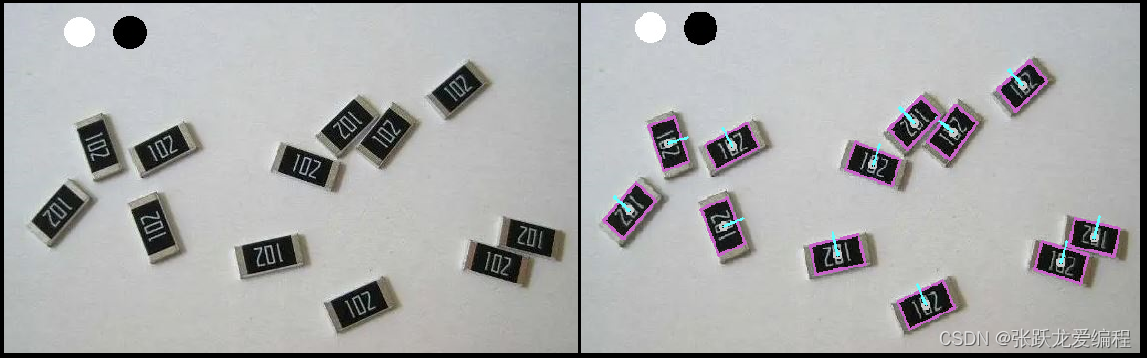 如图所示,1K-0805电阻,分散于白色面上,最终视觉识别出电阻的中心位置和短边角度,这样贴片机就可以准确拾取并贴装。