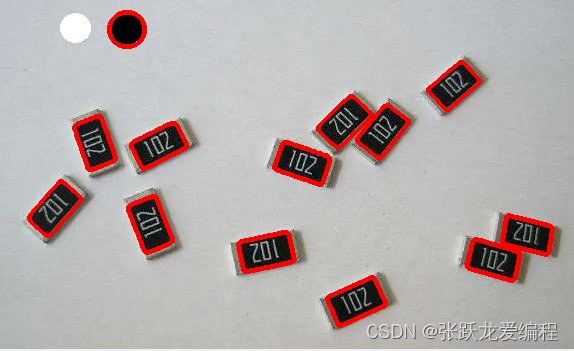 对于一台准备售出的贴片机而言,相机的分辨率,相机安装参数等,都已经固定,在封装设置时,可以根据实际情况,调整每种封装的面积范围,达到过滤的目的。从文中可以得出,opencv对散料图形的处理实际非常简单,而且这种方式对贴片机元件的处理逻辑,基本相同,只需根据贴片机实际情况,设置一次封装的面积大小,可以达到识别所有散料的目的,通用行非常强。图中可以看到,电阻周围的斑点,电阻的规格“102”字符,基本处