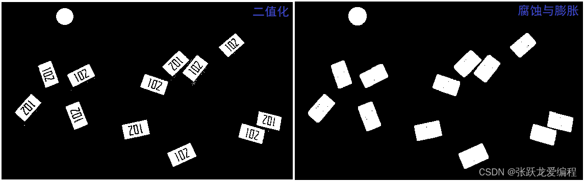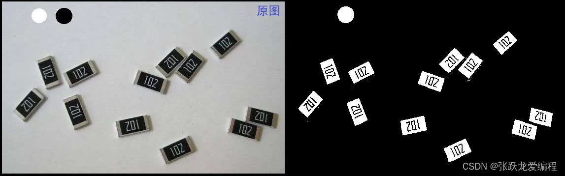 图像二值化以后,基本的电阻位置已经非常明显,但在电阻的周围,我们发现有许多斑斑点点,还有“102”字样也需要处理