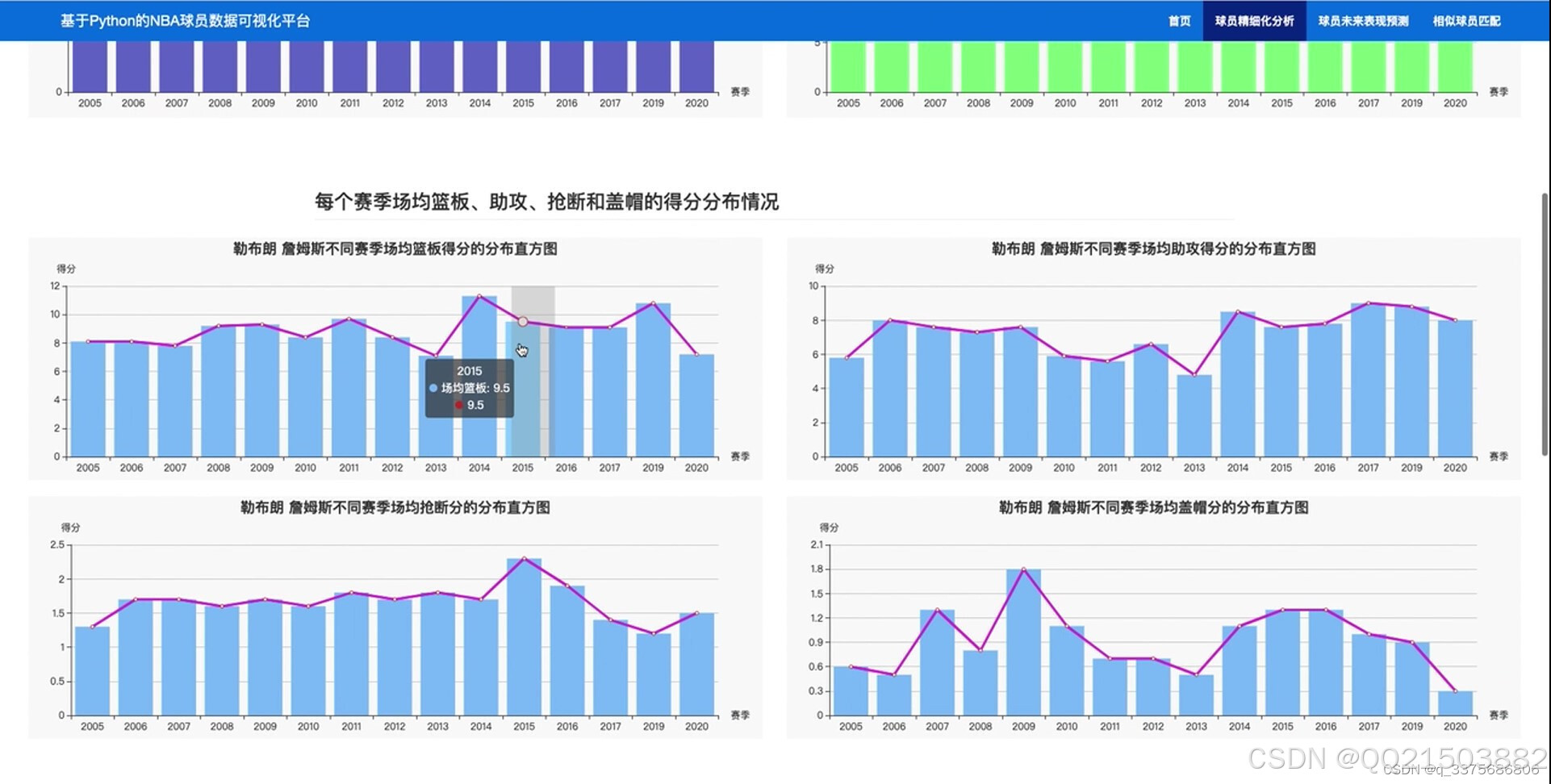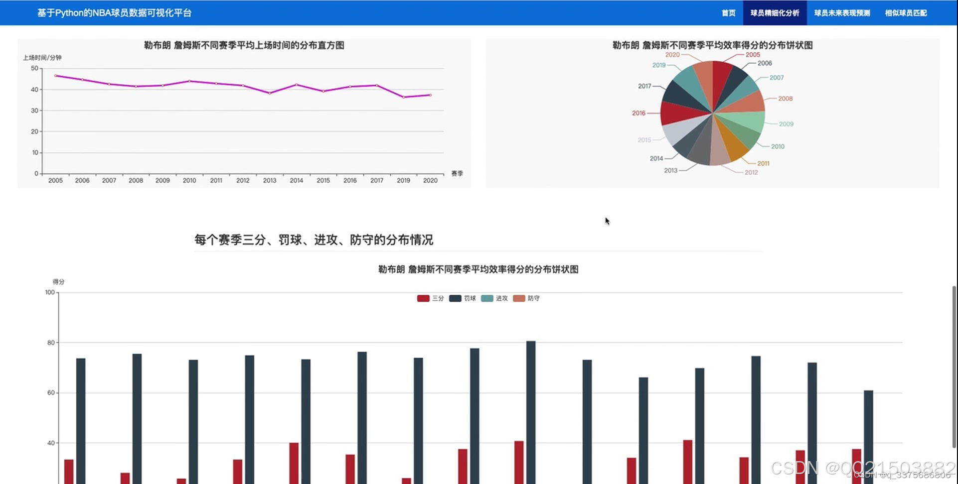 在数据分析方面,系统提供了三个主要的功能模块。第一个模块专注于球员每个赛季的参加场数与平均得分的分布情况,帮助用户了解球员的出勤率和得分能力。第二个模块分析了球员每个赛季在篮板、助攻、抢断和盖帽等关键数据上的得分分布情况,揭示了球员在比赛中的全面表现。第三个模块则关注于球员在三分、罚球、进攻和防守等方面的数据,帮助用户更全面地评估球员的投篮技巧和攻防能力。