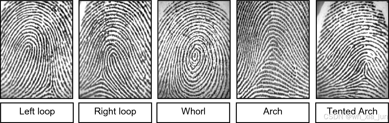 第一个指纹分类规则是由Purkinje(Moenssens,1971)于1823年提出的,他根据脊线方向场将指纹分为九类:横向曲线(transverse curve)、中央纵纹(central longitudinal stria)、斜条纹(oblique stripe)、斜环(oblique loop)、杏仁涡(almond whorl)、螺旋涡(spiral whorl)、椭圆、圆、双螺旋(double whorl)。Francis Galton对指纹分类进行了第一次深入的科学研究,他将指纹分为三大类:弓型、箕型和斗型(螺旋型),并将每个类别进一步划分为子类别(Galton,1892)。大约在同一时间,阿根廷警官Juan Vucetich开发了一种不同的分类系统,至今Vucetich分类系统仍在许多西班牙语国家使用。十年后,Edward Henry通过增加类的数量完善了Galton分类(Henry,1900)。目前全世界多数执法机构使用的是Galton-Henry分类方案的变体。