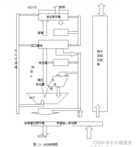 下图所示的是ARM构架图。它由32位ALU、若干个32位通用寄存器以及状态寄存器、32&TImes;8位乘法器、32&TImes;32位桶形移位寄存器、指令译码以及控制逻辑、指令流水线和数据/地址寄存器组成。