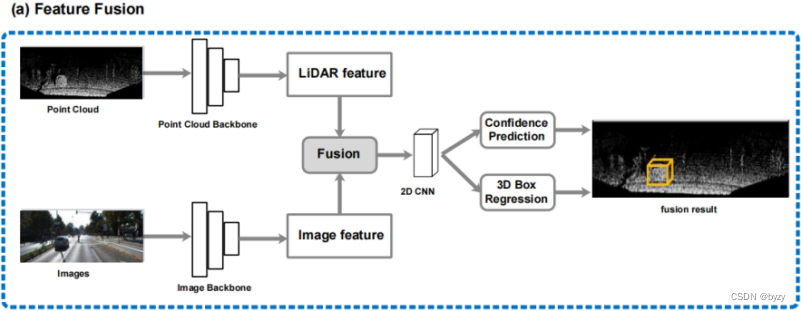 - PointPainting:逐点融合。将点云投影到图像上,将分割分数附加到原始激光雷达点上。缺点是大量点可能没有图像的相应像素(属于图像的被遮挡区域)。