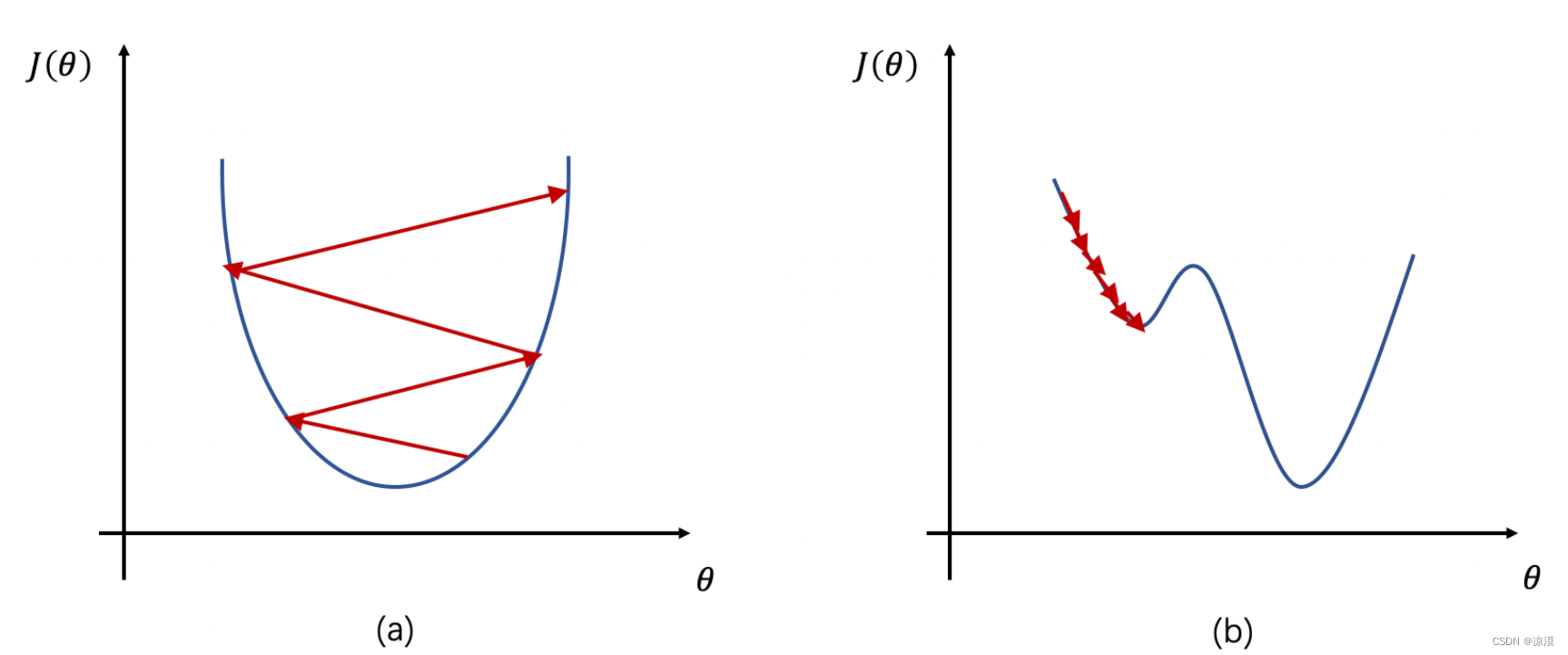 - 如果学习率 η 较大,那么参数的更新速度就会很快,可以加快网络的收敛速度,但如果学习率过大,可能会导致参数在最优解附近震荡,代价函数难以收敛,甚至可能会错过最优解,导致参数向错误的方向更新,代价函数不仅不收敛反而可能爆炸(如图1a所示)。