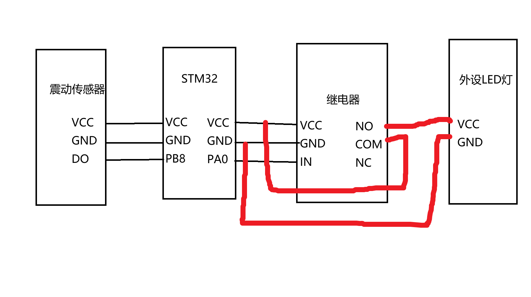 接线上,震动传感器VCC接3.3V,GND接GND,DO接PB8;继电器VCC接3.3V,GND接GND,IN接PA0,COM口接VCC,NO口接LED灯VCC;LED灯VCC接继电器NO口,GND接GND。