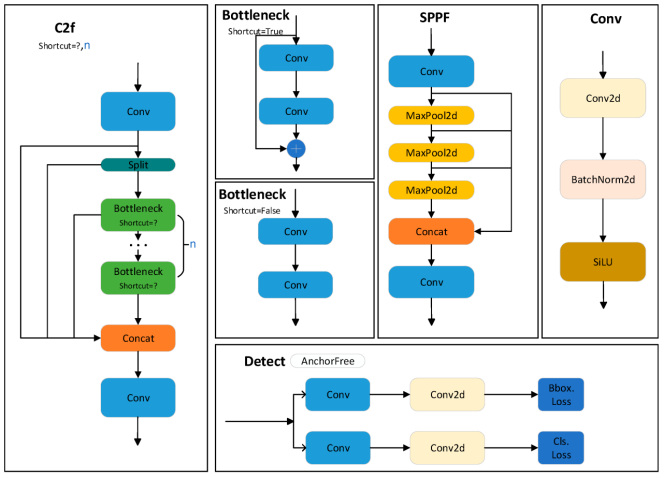 特征提取网络主要通过C2f和SPPF模块从图像中提取不同尺度的特征。C2f模块在原始C3模块基础上减少一个卷积层,使模型更轻量化,同时融入YOLOv7中ELAN结构的优势,利用瓶颈模块有效扩展梯度分支以获取更丰富的梯度流信息。SPPF在SPP(空间金字塔池化)基础上减少网络层,消除冗余操作并实现更快速的特征融合。多尺度融合模块采用FPN(特征金字塔网络)与PAN(路径聚合网络)结合的方式,通过对低层特征和高层特征进行双向融合,增强感受野较小的低层特征,提升对不同尺度目标的检测能力。检测层负责预测目标位置、类别、置信度等信息。YOLOv8的头部从基于锚框(anchor-based)转向无锚框(anchor-free)方式,摒弃IOU匹配或单侧尺度分配,改用任务对齐分配器(task-aligned assigner)进行正负样本匹配,最终利用8×、16×和32×下采样特征进行多尺度预测,实现对小、中、大目标的精准预测。YOLOv8网络中的详细模块如下图所示。