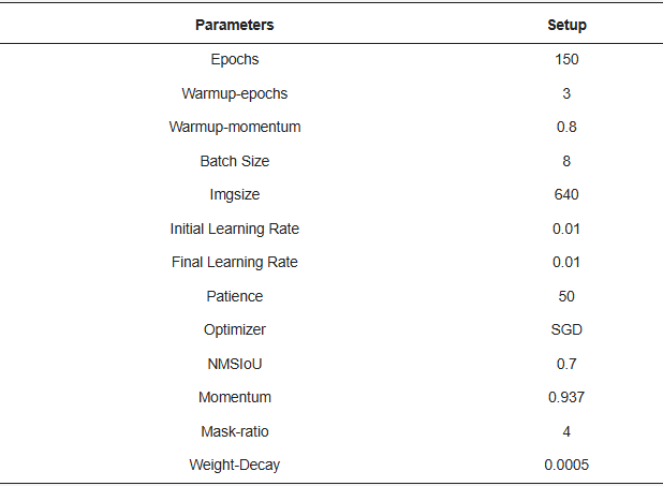 网络训练训练前,数据集图像和标签按7:1:2的比例划分为训练集、验证集和测试集。数据集训练的最大轮次(epochs)设为150,前3轮用于预热训练。采用SGD优化策略调整学习率,初始学习率为0.01。考虑到样本图像中存在大量微小目标,且检测过程需平衡实时性与准确性,样本尺寸统一调整为640×640像素。该尺寸既能保留图像中的关键信息,又便于模型在边缘设备上部署。为确保实验公平性和模型性能的可比性,消融实验和对比实验均不使用预训练权重,且所有训练过程保持一致的超参数设置。训练过程中最重要的参数设置如下表所示。