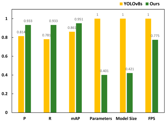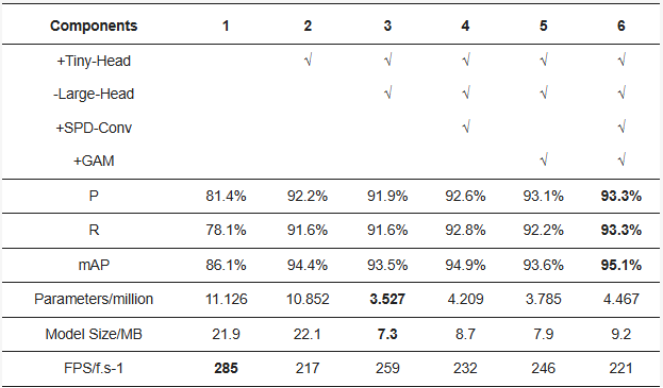 如上图所示,可以发现由于添加了微型检测头、SPD-Conv和GAM模块,增加了一定的推理时间,改进模型的FPS指标达到221/f.s⁻¹,相比基准模型的285/f.s⁻¹有所降低,但在实际部署中仍能保证满足实时性要求。此外,我们的模型相比基准模型在P、R、mAP、参数量和模型大小方面均有显著改进,其中P、R和mAP分别提升了11.9%、15.2%和9%,参数量和模型大小分别减少了59.9%和57.9%,从而证明了改进模型的有效性和实用性。