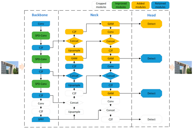 具体改进方案如下:(1)在检测头部分增加高分辨率检测分支,增强模型对微型目标的检测能力;同时裁剪大目标预测的检测层及其相关特征提取与融合层,减少模型参数。 (2)改进多尺度特征提取模块,使用SPD-Conv[32]替代传统卷积(Conv)以提取多尺度特征。 (3)在多尺度融合模块中引入GAM注意力机制[33],强化模型对目标特征的融合效果。