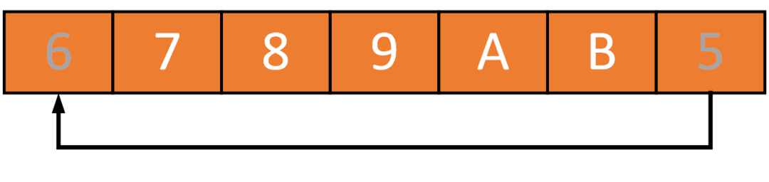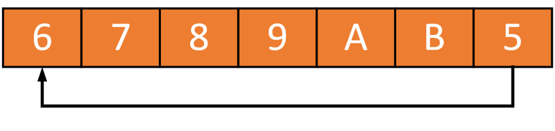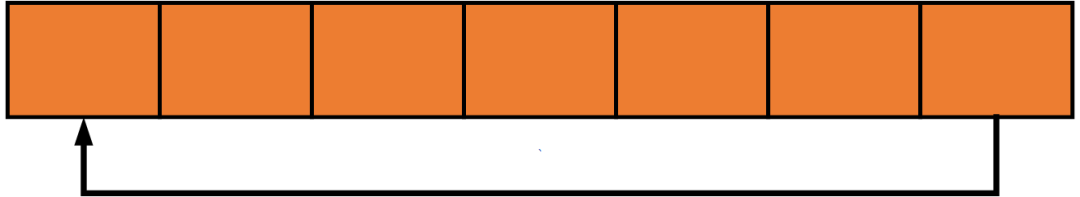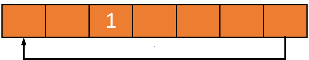 先不要想环形缓冲区(ring buffer)的具体实现细节,来看一个简单的例子。如下是一个空间大小为 7的环形缓冲区,其中底部的单线箭头表示“头尾相连”形成一个环形地址空间: