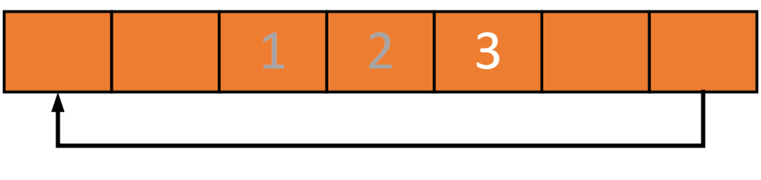 如果读出两个元素,那么环形缓冲区中最老的两个元素将被读出(先进先出原则)。在本例中1和2被读出,缓冲区中剩下3: