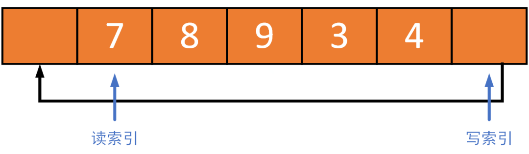 环形缓冲区(ring buffer)也是FIFO类型的数据结构,需要满足先进先出的原则。写就相当于进,读就相当于出。所以读数据时,一定要保证读最老的数据。一般的情况下不会有问题,但有一种场景需要小心。如下图所示环形缓冲区的大小为 七,缓冲区中已经存储了7,8,9,3,4五个元素。