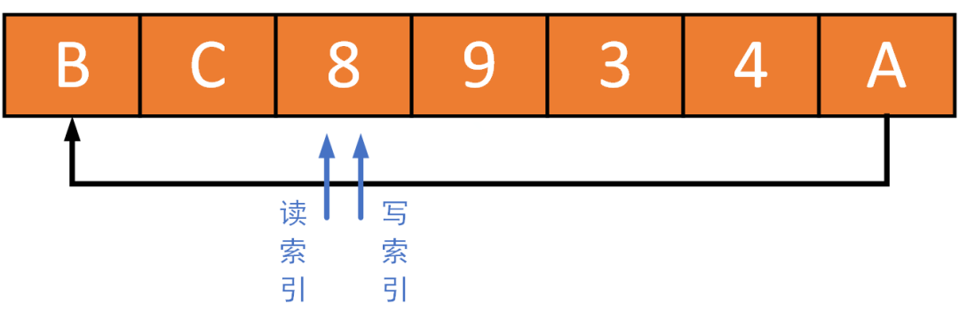 B时,元素B继续被写入写索引当前所指向位置,然后写索引加1,指向下一个位置; -