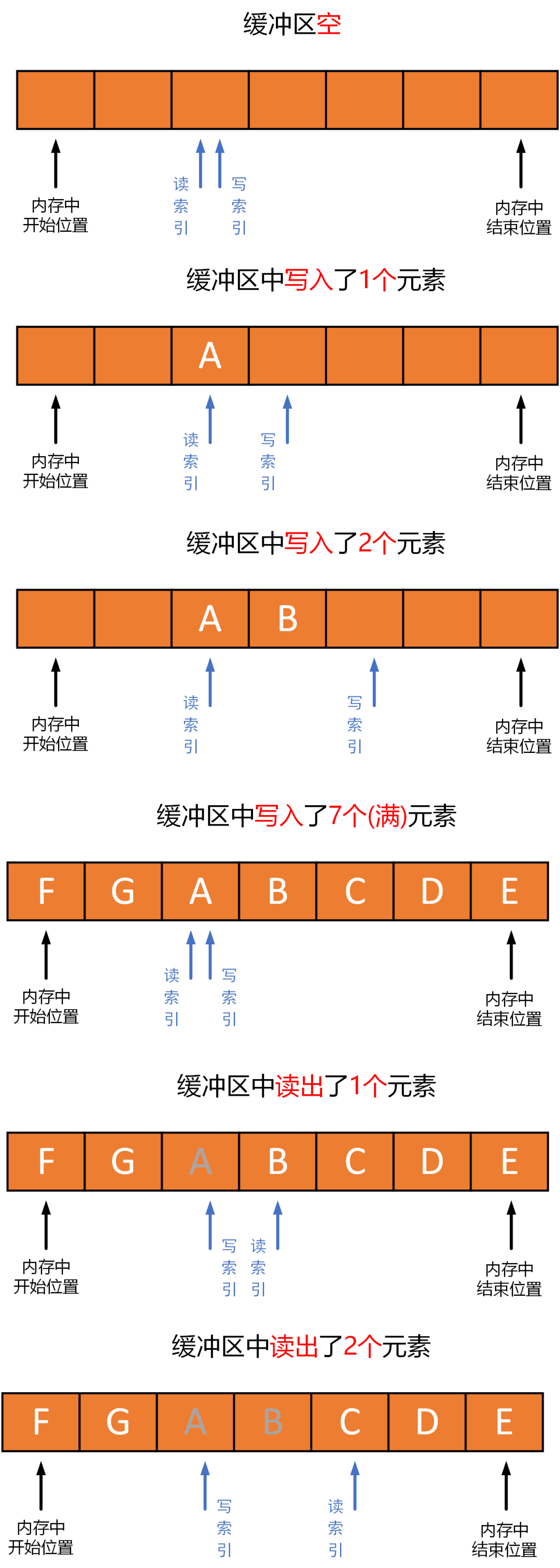 C、D、E、F、G五个元素后,缓冲区就满了,这时写索引和写索引指向同一个位置(和缓冲区为空时一样); -