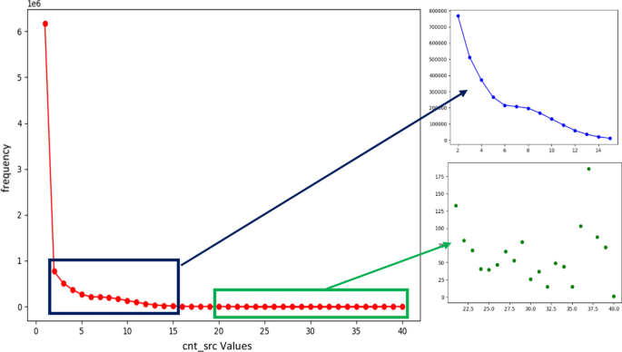 此数据集中很少有数字列(例如 cnt_src)具有离散数字和几十个唯一值。图 3显示了 cnt_src 列中的值以及每个值的频率。值 1 在此列中重复了超过 600 万次,而值 2 和 10 之间的值重复了 100 到 800 十万次。相反,其他值(例如 20 到 40 之间的值)的频率小于 200。