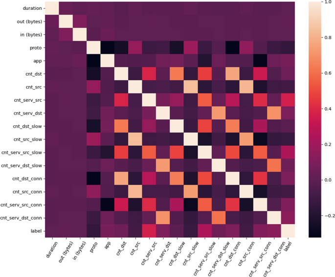 从图 4中可以明显看出,应该预测的标签(输出)与流量的任何输入特征都没有高度相关。此外,该功能与其后缀为“_slow”和“_conn”的版本之间只有中等相关性 (0.5–0.8)。例如,cnt_src 与 cnt_src_slow 和 cnt_src_conn 具有中等相关性。因此,没有流量特征被丢弃,因为没有人与其他人具有高相关性。