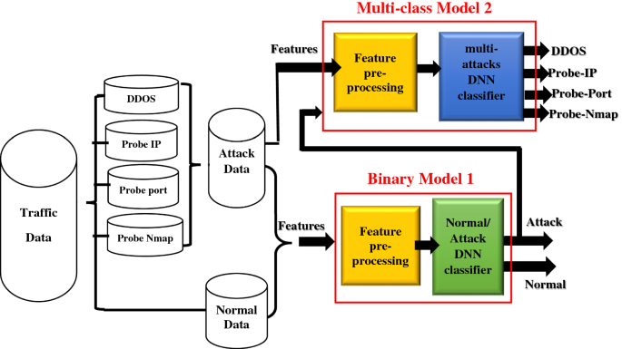 在本节中,描述了所提出的模型融合方法。模型融合包含两个深度神经网络。二元模型 1 包括特征预处理和 DNN。DNN 用作二元分类器,通过将流量数据分为两类来检测任何攻击:正常和攻击。为了组成新的攻击流量集,将包括 DDOS smurf、IP 探测、PORT 探测和 NMAP 探测在内的四种类型的攻击组合为一组,如图 5所示。两组新的攻击流量和正常流量被馈送到二进制 DNN。