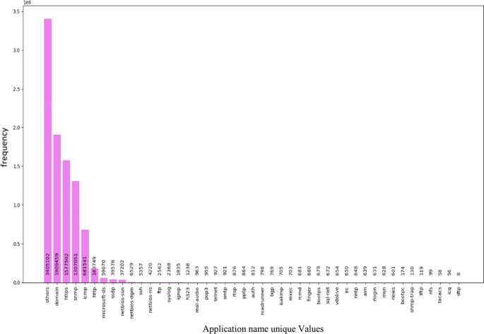 这些唯一值中的每一个都以不同的方式在交通记录中重复。例如,https 重复了 1,577,502 次,而 sftp 只重复了 8 次。图 1显示了应用程序名称列中的 45 个唯一值以及每个值的出现频率。应用程序名称列中的字符串值已转换为数值以供进一步处理。具有 45 个唯一值的列的单热编码导致具有大量零的稀疏矩阵。因此,为避免内存问题,未对该列进行编码。然而,它被重新缩放和裁剪。