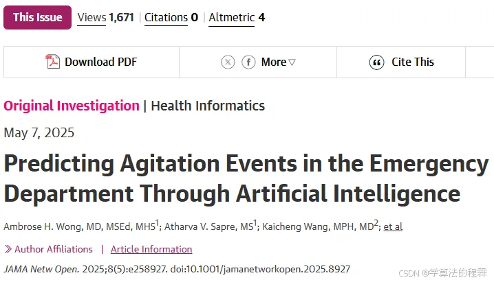 2025年5月7日,JAMA子刊《JAMA Network Open》(医学一区top,IF=10.5)发表了一项机器学习预测模型文章,题为:“Predicting Agitation Events in the Emergency Department Through Artificial Intelligence”。