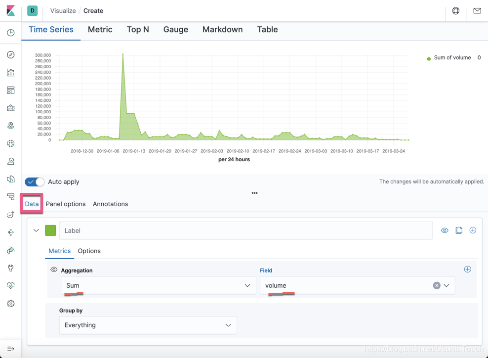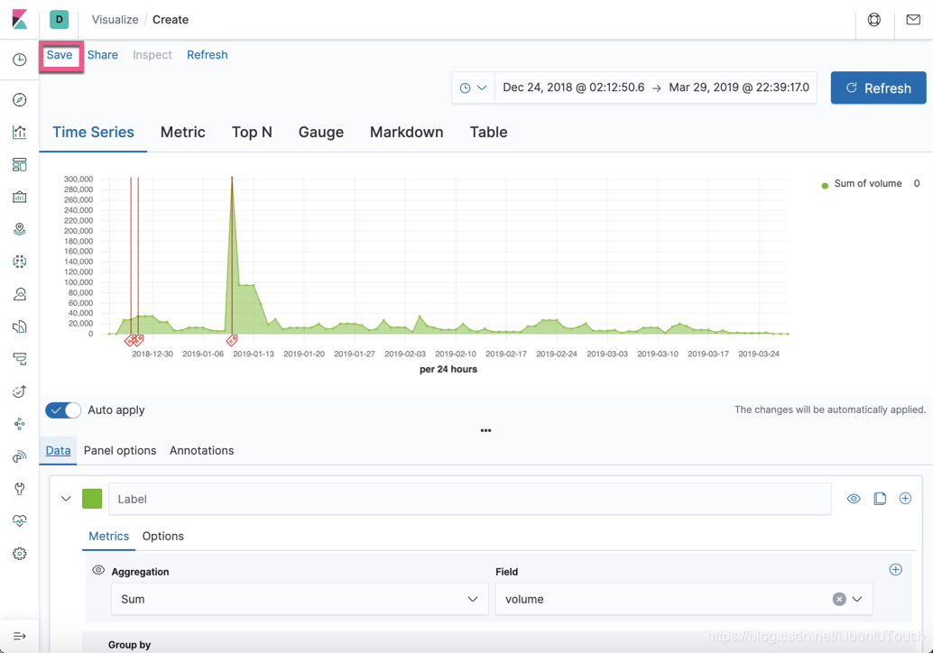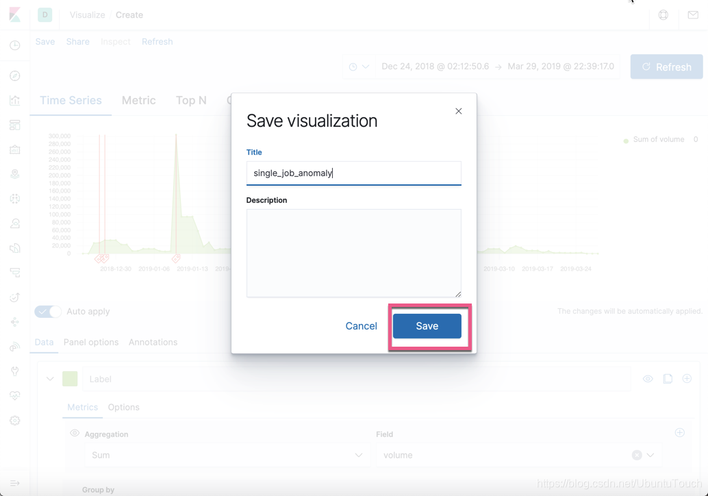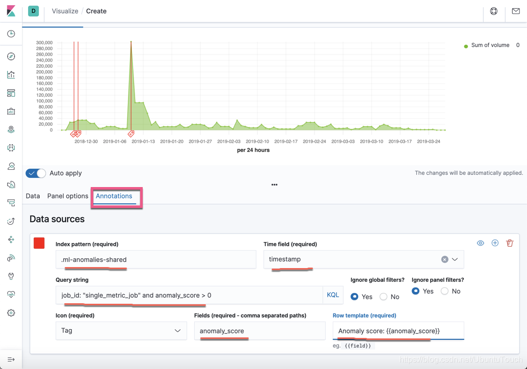 从上面,我们可以看出来一些和 ML 相关的索引。其中 .ml-anomalies-shared 就是这样的一个索引,其中含有我们机器学习作业里的异常数据。我们可以通过 TSVB 的方式来对它进行展示。