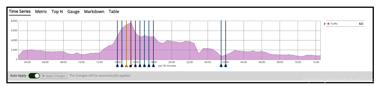 当我们把鼠标放到异常出现的红色的标志那里就可以看到 Anomaly score。这个是我们刚才在 Annotation 里进行设置的。