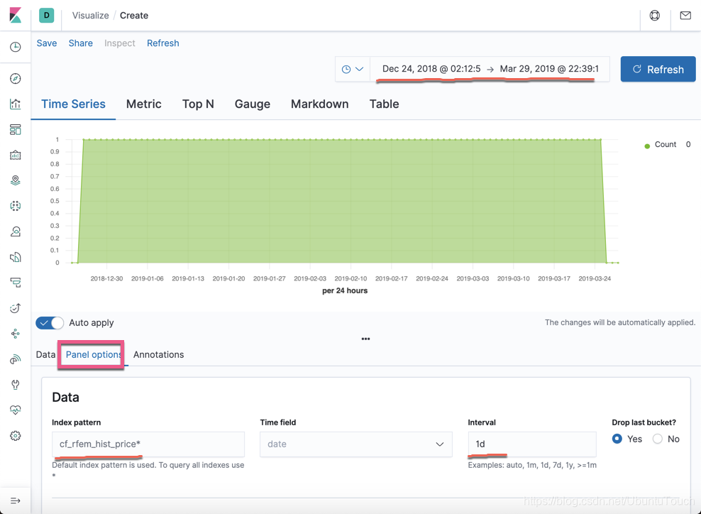 在上面选择 cf_rfem_hist_price* 作为 index pattern。同时我们选择 1d 作为 interval。点击 Data: