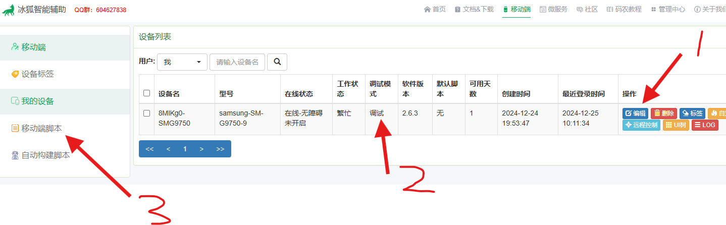 在冰狐官网中,先将设备改成调试模式,然后在移动端脚本中新建脚本