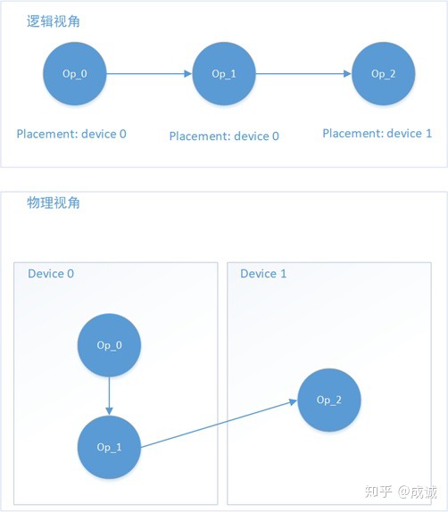 这里先明确两个概念:“逻辑上的”和“物理上的”。“逻辑上的”表示OneFlow把分布式集群抽象成一个超级计算机之后的计算和数据,“物理上的”表示那些真实的部署到各个机器和设备上的计算和数据。深度学习网络是由Op构成的计算图,Op之间生产消费Tensor数据。在多机多卡的环境下,一个逻辑上的Op会对应多个真实的物理上的Op,每个物理上的Op实际执行的计算都是这个逻辑Op计算的一部分,一个逻辑上的Tensor也会对应多个物理上的Tensor,每个物理上的Tensor都是逻辑Tensor的一部分。