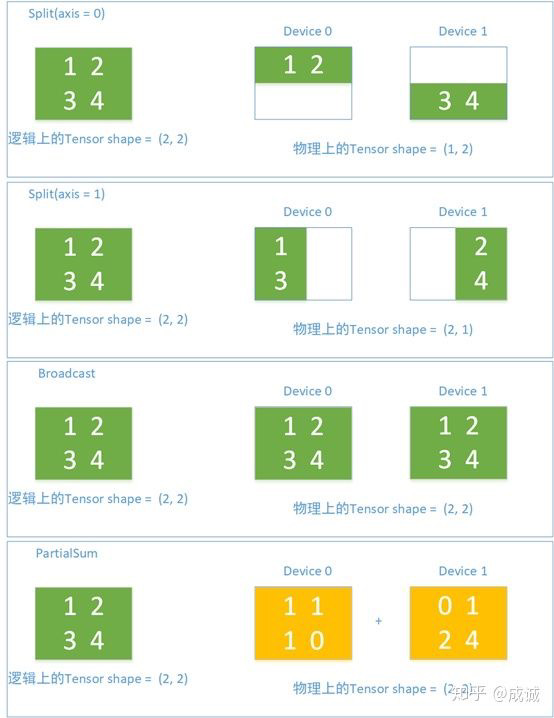 SBP是OneFlow独有的概念,它是三个单词的首字母组合:Split、Broadcast、PartiaSum(以PartialSum为例,实际上还可以是PartialMin, PartialMax等reduce操作),全称叫SbpParallel,表示一种逻辑上的Tensor跟物理上的多个Tensor的映射关系。其中Split表示物理上的Tensor是逻辑Tensor按照某一维度切分后得到的, Split有个参数axis,表示切分的维度,如果把多个物理上的Tensor按照Split的维度进行拼接,就能还原出逻辑Tensor;Broadcast表示物理上的Tensor是跟逻辑上的Tensor完全相同的;PartialSum表示物理上的Tensor虽然跟逻辑上的Tensor形状一致,但是物理上的Tensor里的值是逻辑Tensor里对应位置的一部分,如果把物理上的多个Tensor按照对应位置相加,即可还原出逻辑上的Tensor。图5展示了SBP的简单示例。
